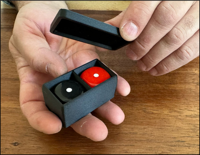 Der Vorführende kennt die Anzahl der Würfelaugen, die in der verschlossenen Box oben liegen. Anleitung mit einem kurzen Film durch WhatsApp.